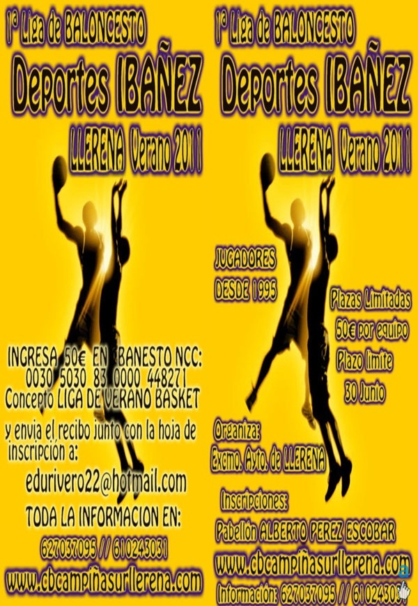 El AYUNTAMIENTO DE LLERENA, con la colaboración del CB CAMPIÑA SUR y el patrocinio de DEPORTES IBAÑEZ, organiza esta verano la primera edición de la LIGA DE BALONCESTO DEPORTES IBAÑEZ LLERENA VERANO'11. El plazo de inscripción queda abierto y la participación será limitada en el numero de equipos por lo que  los interesados deben inscribirse lo antes posible ente la posibilidad de que se cierre la inscripcion. La inscripcion se hara mediante el pago de los 50€ en Banesto en la cuenta detallada en la informacion y la inscripcion con ese recibo del equipo en el pabellon ALBERTO PEREZ. Los equipos que no sean de LLERENA y quieran participar deben hacer el ingreso en la entidad bancaria y enviarlo junto con la inscripción del equipo a edurivero22@hotmail.com. En la inscripcion del equipo debe constar el nombre del equipo, el nombre de los jugadores, hasta 15 pudiendo inscribir solo 12 en los partidos, el nombre del entrenador o responsable del equipo y un mail y telefono de contacto. No obstante para cualquier tipo de información o aclaración no dudes en llamar a cuelquira de estos telefonos: 627037095 // 610243031. Descargate aqui la informacion necesaria