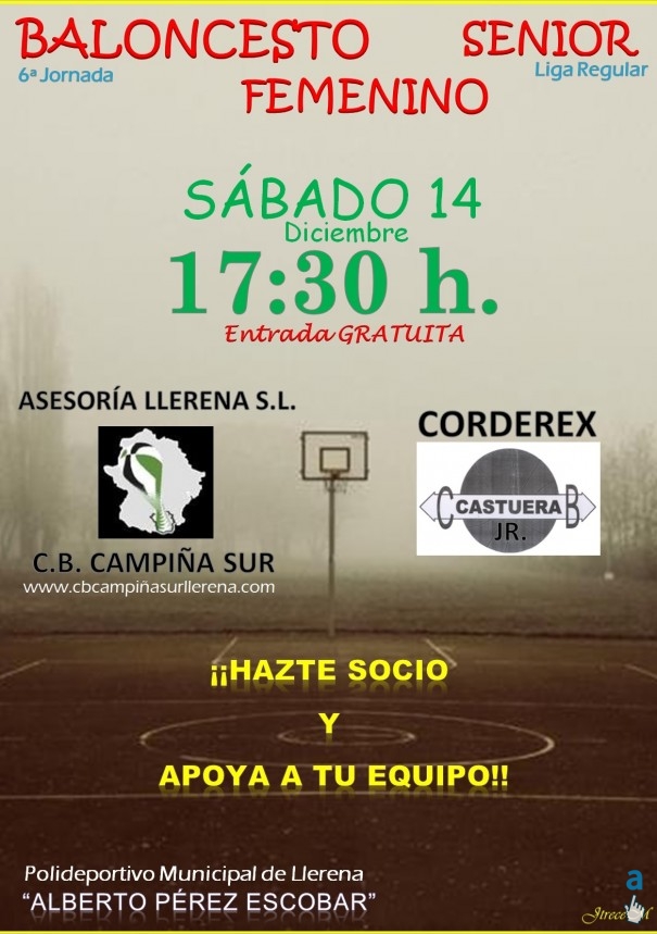 El ASESORÍA LLERENA: Pabellón Municipal de Llerena "Alberto Pérez" a las 17:30 hs. frente a CORDEREX CASTUERA C.B. JR. Complicado partido, correspondiente a la sexta jornada, frente a uno de los dos equipos más fuertes del grupo y segundas en la clasificación. Las "llerenitas", esperamos resarcirnos de las dos derrotas consecutivas y volver a la senda de las victorias. Después de las dos derrotas, en el equipo no hemos bajado los brazos, sino todo lo contrario: más ánimo y trabajo. Para ello necesitaremos el apoyo del público, que nos dé el empuje necesario para alcanzar la victoria. ENTRADA GRATUITA. ¡VUESTRO APOYO ES FUNDAMENTAL! Promo del partido: http://www.youtube.com/watch?v=25HKzkuAfpc&feature=youtu.be