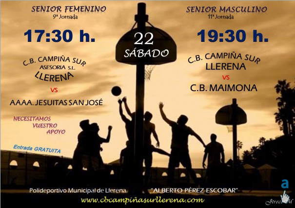 A las 19:30 hs., en la 11ª jornada del Trofeo Diputación, el SÉNIOR MASCULINO del C.B. CAMPIÑA SUR DE LLERENA se enfrenta al líder de la competición, el C.B. Maimona. Difícil rival, pero nuestro equipo va a por todas y más después de la última derrota. Una victoria ante un gran equipo, que cuenta con amigos y ex-jugadores del club, nos permitiría igualarles en lo más alto de la tabla y mantener intactas nuestras opciones de meternos en los playoffs.