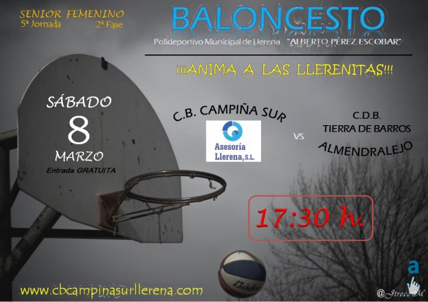 El sábado por la tarde, el sénior femenino ASESORÍA LLERENA C.B. CAMPIÑA SUR, jugamos frente a C.D.B. Tierra de Barros a las 17:30 hs. en el "ALBERTO PÉREZ", el último partido de la segunda fase. Las "llerenitas", con el liderato del grupo de Badajoz y con la clasificación para la tercera fase asegurados, intentaremos cerrar con victoria esta fase.