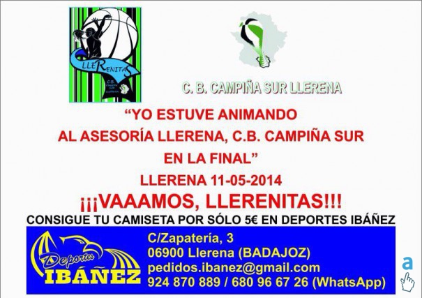 El domingo 11 de mayo a las 11:00 hs., en el "Alberto Pérez", el plato fuerte para los llerenenses. La final sénior femenina entre ASESORÍA LLERENA C.B. CAMPIÑA SUR - A.D.21 DON BENITO. Esperamos el apoyo de todos los llerenenses y que se "llenen" las gradas del pabellón. Animando, siempre de forma deportiva como es habitual, y llevando en volandas a nuestras "llerenitas". Para ello, vamos a dar colorido a las gradas, con camisetas de apoyo al equipo. En Deportes Ibáñez, por tan solo 5 €, puedes hacerte con la camiseta que te identificará como aficionada o aficionado del C.B. Campiña Sur de Llerena. En resumen, cita importantísima de nuestras chicas, en la que se espera una gran respuesta y apoyo de todos los habitantes de Llerena.