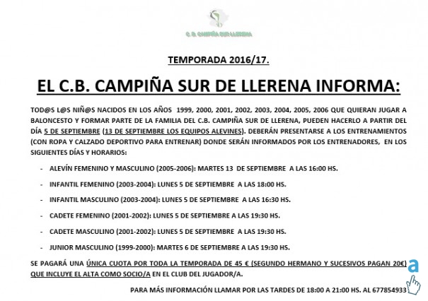 TOD@S L@S NIÑ@S NACIDOS EN LOS AÑOS   1999, 2000, 2001, 2002, 2003, 2004, 2005 Y 2006 QUE QUIERAN JUGAR A BALONCESTO Y FORMAR PARTE DE LA FAMILIA DEL C.B. CAMPIÑA SUR DELLERENA, PUEDEN HACERLO A PARTIR DEL DÍA 5 DE SEPTIEMBRE. DEBERÁN PRESENTARSE A LOS ENTRENAMIENTOS (CON ROPA Y CALZADO DEPORTIVO PARA ENTRENAR) DONDE SERÁN INFORMADOS POR LOS ENTRENADORES,  EN LOS DÍAS Y HORARIOS INDICADOS EN EL CARTEL QUE ACOMPAÑA ESTA NOTICIA.