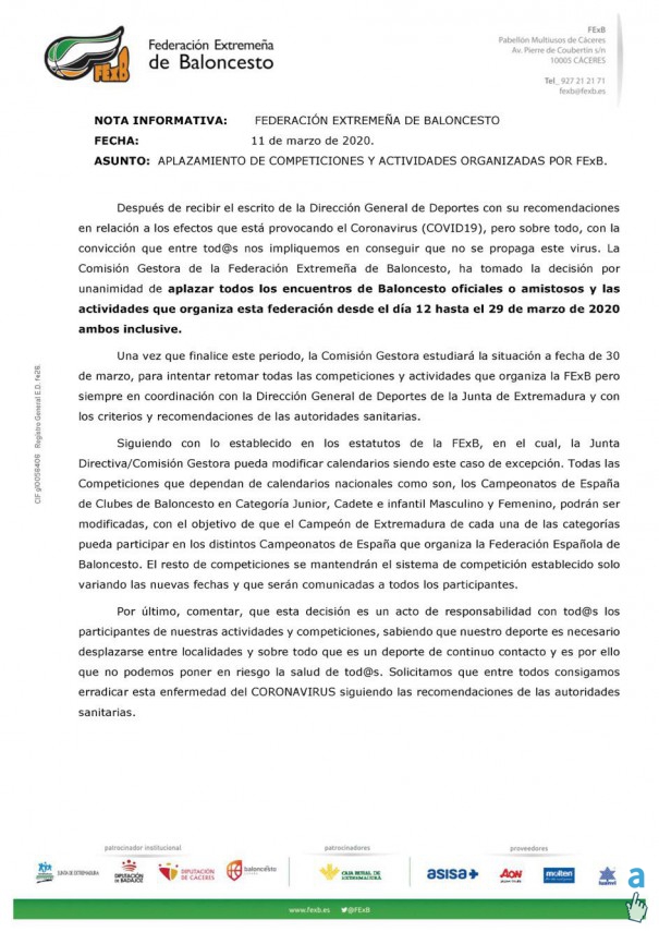 NOTA INFORMATIVA DE LA FEDERACIÓN EXTREMEÑA DE BALONCESTO: "Después de recibir el escrito de la Dirección General de Deportes con sus recomendaciones en relación a los efectos que está provocando el Coronavirus (COVID19), pero sobre todo, con la convicción que entre tod@s nos impliquemos en conseguir que no se propague este virus. La Comisión Gestora de la Federación Extremeña de Baloncesto ha tomado la decisión por unanimidad, de aplazar todos los encuentros de Baloncesto oficiales o amistosos de todas las categorías y las actividades que organiza esta federación desde el día 12 hasta el 29 de marzo de 2020, ambos inclusive. Una vez que finalice este periodo, la Comisión Gestora estudiará la situación a fecha de 30 de marzo, para intentar retomar todas las competiciones y actividades que organiza la FExB, pero siempre en coordinación con la Dirección General de Deportes de la Junta de Extremadura y con los criterios y recomendaciones de las autoridades sanitarias. Siguiendo con lo establecido en los estatutos de la FExB, la Junta Directiva/Comisión Gestora podrá modificar calendarios si fuera necesario, siendo este caso de excepción. Todas las Competiciones que dependan de calendarios nacionales como son los Campeonatos de España de Clubes de Baloncesto en Categoría Junior, Cadete e infantil Masculino y Femenino, podrán ser modificadas, con el objetivo de que el Campeón de Extremadura de cada una de las categorías pueda participar en los distintos Campeonatos de España que organiza la Federación Española de Baloncesto. En el resto de competiciones se mantendrá el sistema de competición establecido solo variando las nuevas fechas y que serán comunicadas a todos los participantes. Por último, comentar que esta decisión es un acto de responsabilidad con tod@s los participantes de nuestras actividades y competiciones, sabiendo que en nuestro deporte es necesario desplazarse entre localidades y sobre todo que es un deporte de continuo contacto. Es por ello que no podemos poner en riesgo la salud de tod@s. Esperamos que entre todos consigamos frenar el avance esta enfermedad del CORONAVIRUS siguiendo las recomendaciones de las autoridades sanitarias". En la imagen adjunta se puede ver el documento al detalle.