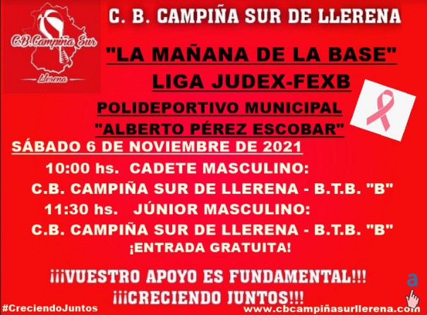 El próximo sábado 6 de noviembre, juegan nuestros equipos: los de la BASE que compiten, y el SÉNIOR MASCULINO, que juega la mañana del domingo en la pista del C.B. Xerixia. Los equipos infantil y júnior femenino, jugarán fuera de casa, en las pistas C.B. Sajra y del P.M.D. Azuaga, respectivamente. Tendremos "LA MAÑANA DE LA BASE" en el "ALBERTO PÉREZ", con nuestros equipos masculinos.. Esperamos el apoyo de todos los familiares y de la afición, con deportividad (como siempre) y cumpliendo con las medidas de seguridad COVID-19.