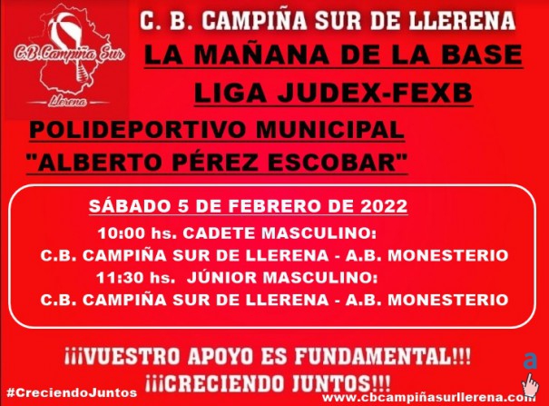 Nuestros equipos de la base que compiten, juegan el próximo sábado 5 de febrero. Los equipos infantil y júnior femenino juegan fuera de casa. Las infantiles jugarán en la pista de A.B. Oliva y las juniors en la del colegio San José de Villafranca. Los equipos cadete y júnior maculino, juegan en casa en "LA MAÑANA DE LA BASE". Esperamos el apoyo de la afición, con deportividad (como siempre) y cumpliendo con las medidas de seguridad COVID-19. ¡No faltéis! Y nuestro equipo sénior masculino AUTOTRASUR,S.L. LANDINI-JAMÓN Y SALUD, juega en la complicada pista del U.B. ALMENDRALEJO, la mañana del domingo.