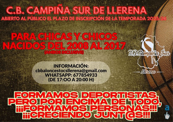 L@S NIÑ@S NACID@S EN LOS AÑOS  2008, 2009, 2010, 2011, 2012, 2013,  2014, 2015, 2016 y 2017 QUE QUIERAN FORMARSE COMO JUGADORES/AS, FORMARSE COMO PERSONAS Y FORMAR PARTE DE LA FAMILIA DEL C.B. CAMPIÑA SUR DE LLERENA, PUEDEN HACERLO.